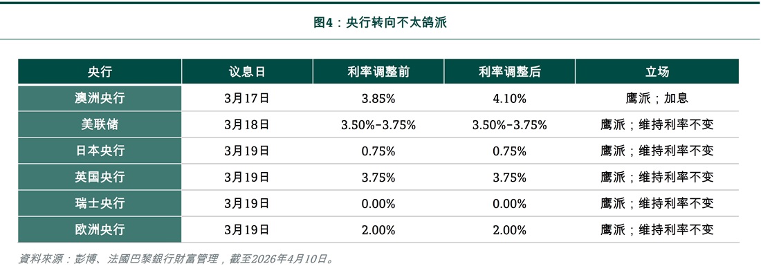 对于美联储,鉴于通胀上行风险及劳动市场趋向平衡,我们目前预测今年不再减息(先前预期会减息一次)。至于欧洲央行,我们预计他们今年维持利率不变,尽管今年底前加息的风险已显著上升。
