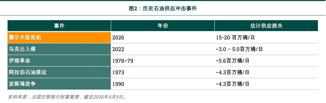 冲突导致的供应中断现已正式成为历史上规模最大的石油供应冲击(见图2)。与以往重大供应冲击事件,平均每日供应损失约500万桶(mb/d)相比,霍尔木兹海峡关闭导致的1,500–2,000万桶/日(约占全球石油需求20%)供应缺口规模是庞大的,因为几乎没有可行替代路线绕过此航道。短期内,沙特通往红海的输油管、阿联酋替代路线、浮动储油、制裁豁免及战略石油储备的释放等措施已将缺口缩减至每日700–1,000万桶,但缓冲时间正逐渐减少。