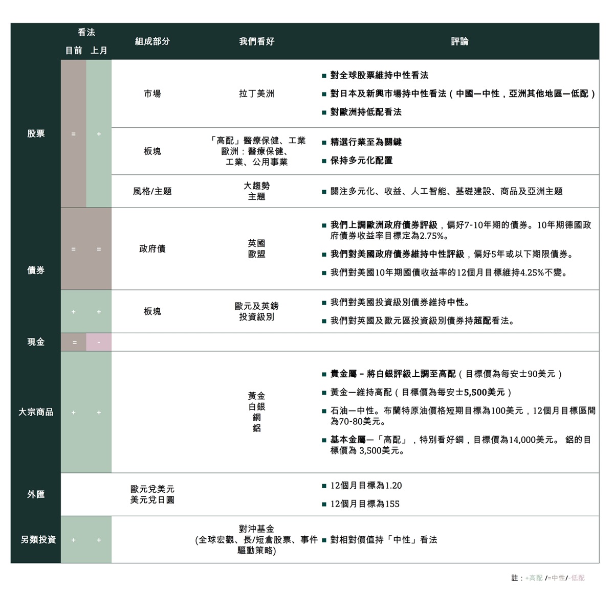 現階段我們繼續主張構建多元化投資組合,偏好價值型及防守型股票。衝突過後,由於海灣合作委員會成員國可能擺脫對石油美元的依賴,預計去美元化的分散投資趨勢會恢復。美元轉弱加上通脹可能升温(導致實際利率下降)將支撐金價,所以我們對黃金維持高配評級,目標價定為每安士5,500美元。我們同時將白銀的評級由中性上調至正面,目標價會每安士90美元。話雖如此,投資者亦預備投資清單,以便在不確定性進一步消散時入市。若這場衝突能達成可信解決方案,受創最深的地區(尤其是亞洲)將最為受惠。