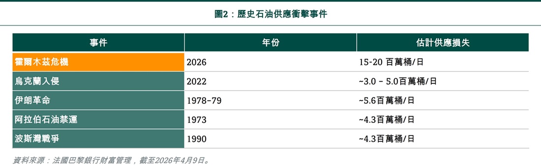 衝突導致的供應中斷現已正式成為歷史上規模最大的石油供應衝擊(見圖2)。與以往重大供應衝擊事件,平均每日供應損失約500萬桶(mb/d)相比,霍爾木茲海峽關閉導致的1,500–2,000萬桶/日(約佔全球石油需求20%)供應缺口規模是龐大的,因為幾乎沒有可行替代路線繞過此航道。短期內,沙特通往紅海的輸油管、阿聯酋替代路線、浮動儲油、制裁豁免及戰略石油儲備的釋放等措施已將缺口縮減至每日700–1,000萬桶,但緩衝時間正逐漸減少。
