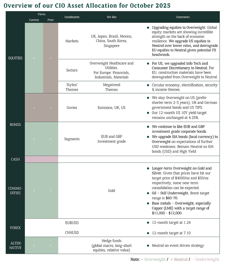 - With that, we are now Overweight on Global Equities. Region wise, we are Neutral on US and EU equities, and Overweight on Japan as well as Emerging Markets (including China).
