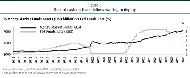 - Investor positioning is likely to support risk assets, as the pace of rotation away from money market funds picks up, driven by the forecast of lower interest rates.